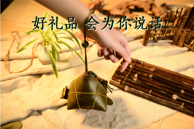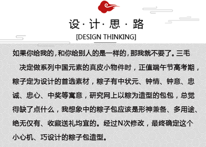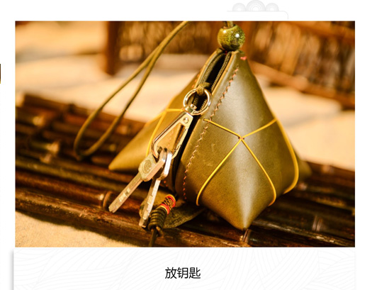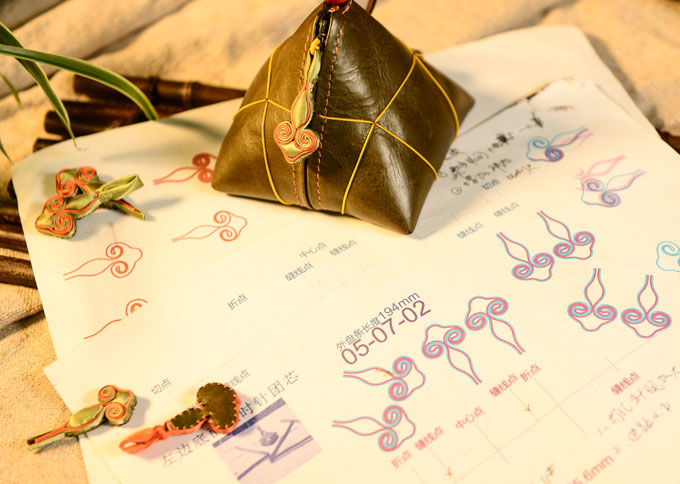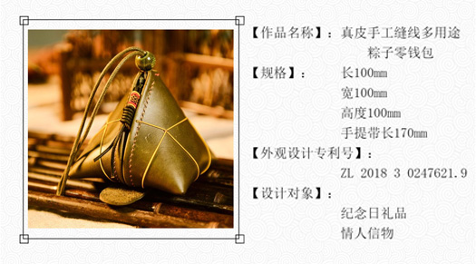 决定做系列中国元素的真皮小物件时,正值端午节高考期,广东特产肇庆粽定为设计的首选素材,为五角粽,金字塔形状,有稳重步步高之态,蕴含中状元、钟情、钟意、钟爱、忠诚、忠心、万众一心众志成城等中国智慧,研究网上以粽为造型的包包,总觉得缺少点文化灵魂,我想象中的粽子包应该是形神兼备、多用途、绝无仅有、收藏送礼均宜的。经过N次修改,最终确定这个小心机、巧设计的粽子包造型,并获得国家知识产权局颁发的外观专利证书。