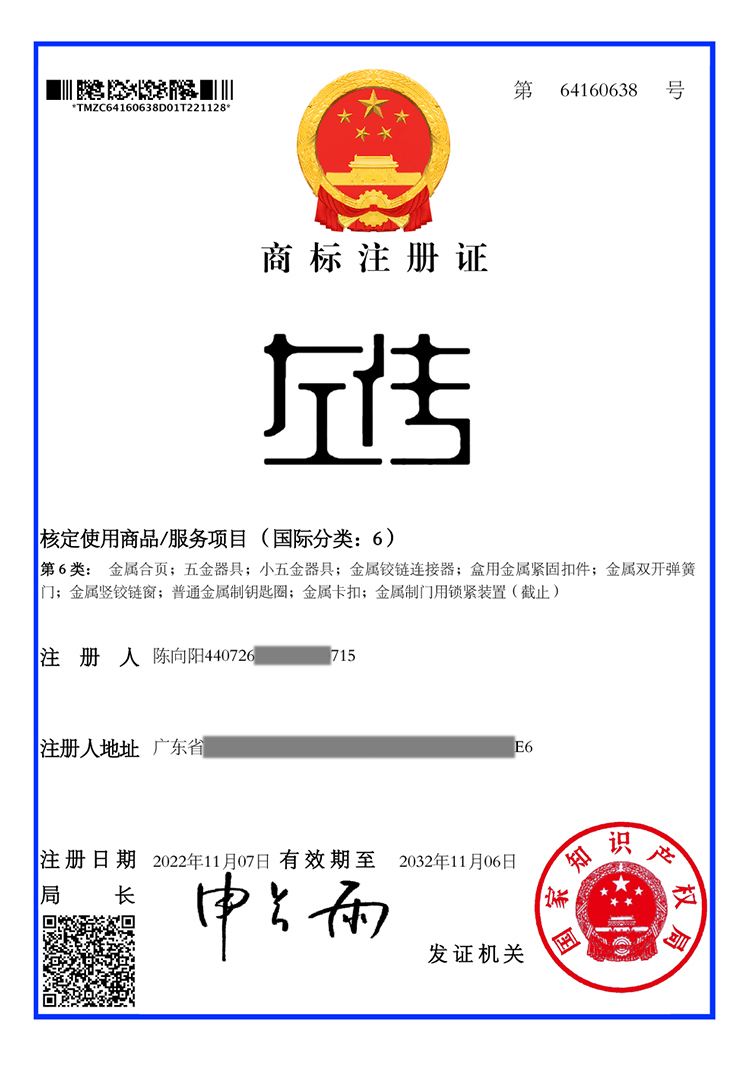 第6类商标(金属配件、转轴、铰链、合页等):